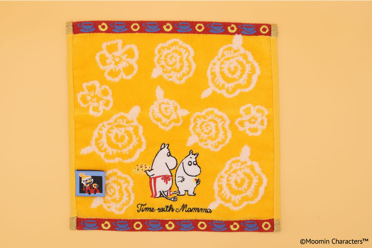 「ムーミンママ」と「ムーミントロール」の刺繍が施された、温かみのあるミニタオル。