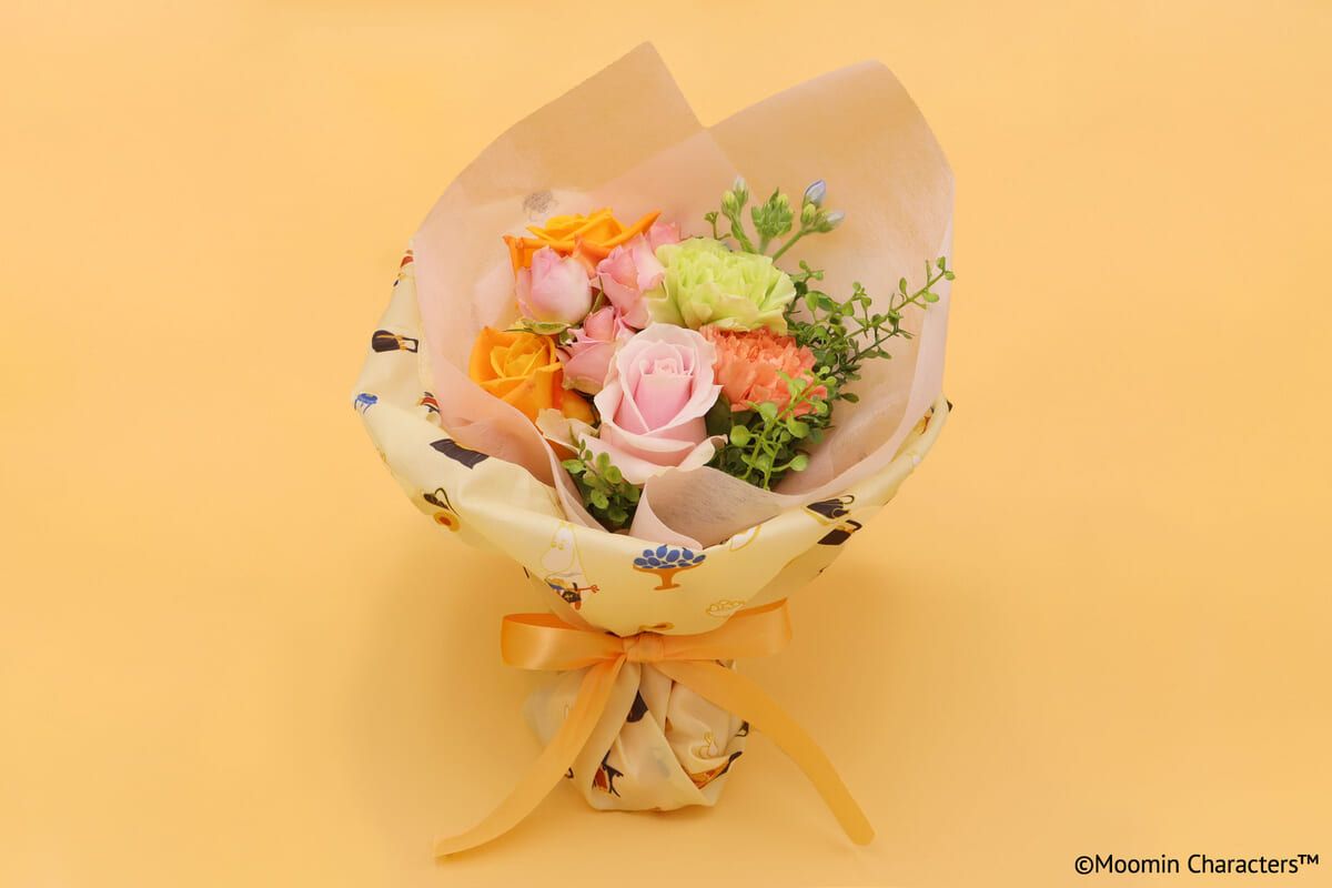 お花をふんわりと包んだブーケスタイルのギフトは、「ムーミンママ」たちのアートが描かれたエコバッグ。