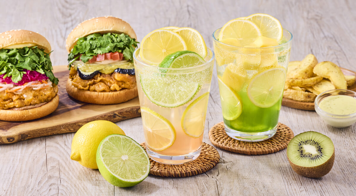 ハンバーガーチェーン「フレッシュネスバーガー」に、氷を一切使わず、フルーツを凍らせた果実氷をゴロッと豪快に使用した「フローズンライム ピーチレモネードソーダ」と「フローズンマンゴー キウイレモネードソーダ」が期間限定で登場。