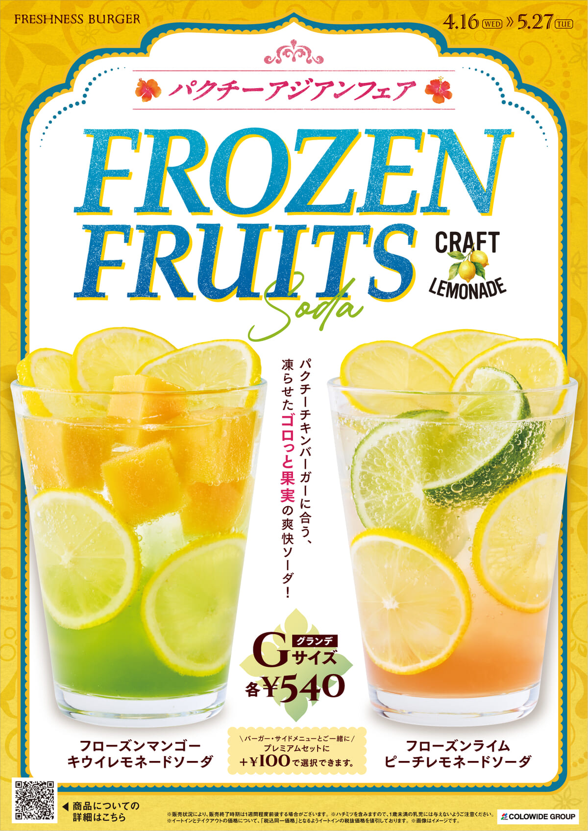 フレッシュネスバーガー「パクチーアジアンフェア」フローズンライム ピーチレモネードソーダ/フローズンマンゴー キウイレモネードソーダ