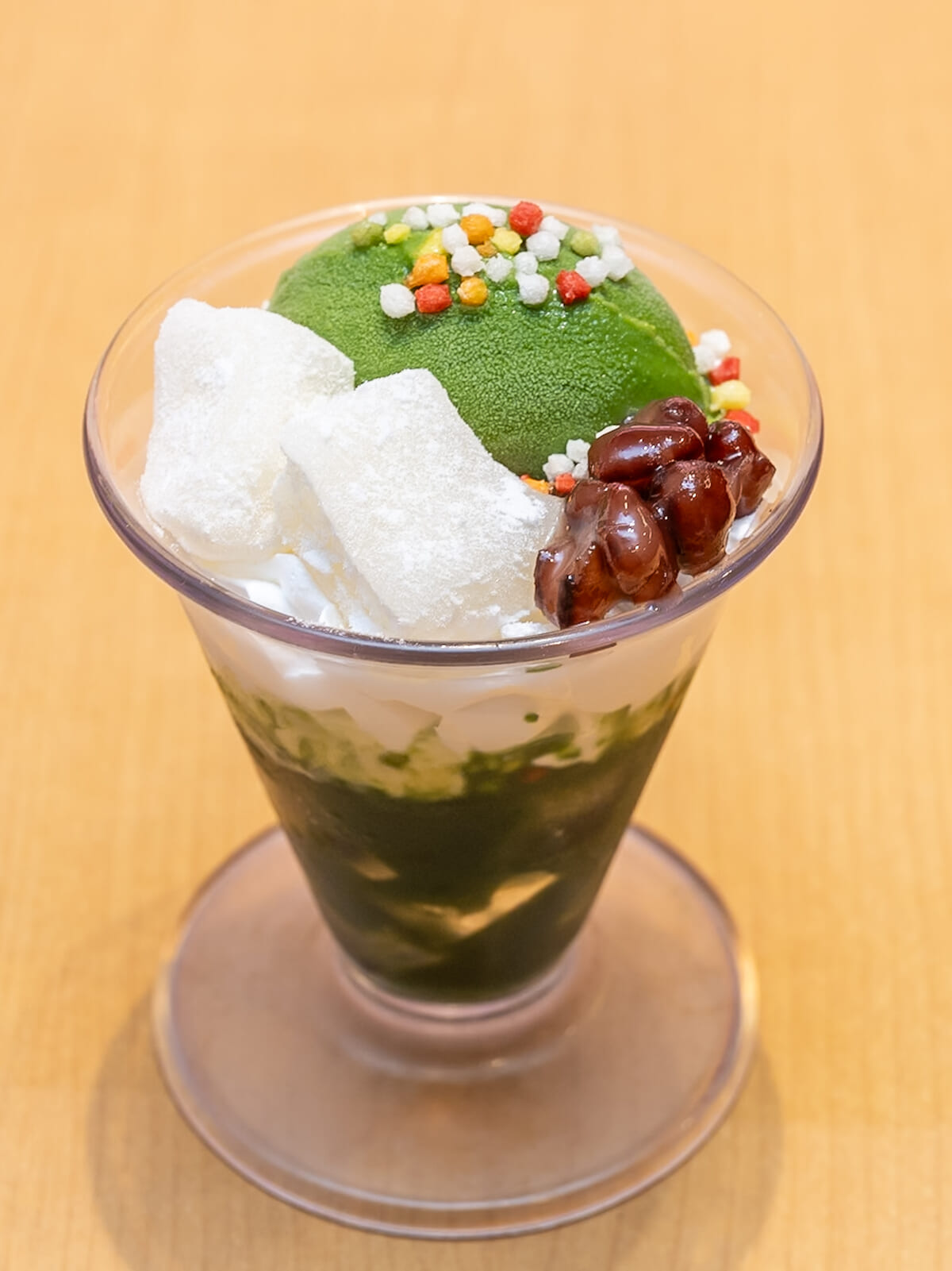 主役の森半抹茶アイスと抹茶蜜に、つるっとした喉ごしの寒天風ゼリー、コシと柔らかな食感が楽しめる小粒の求肥、北海道産の大納言ゆであずきを合わせてあるのも特徴。