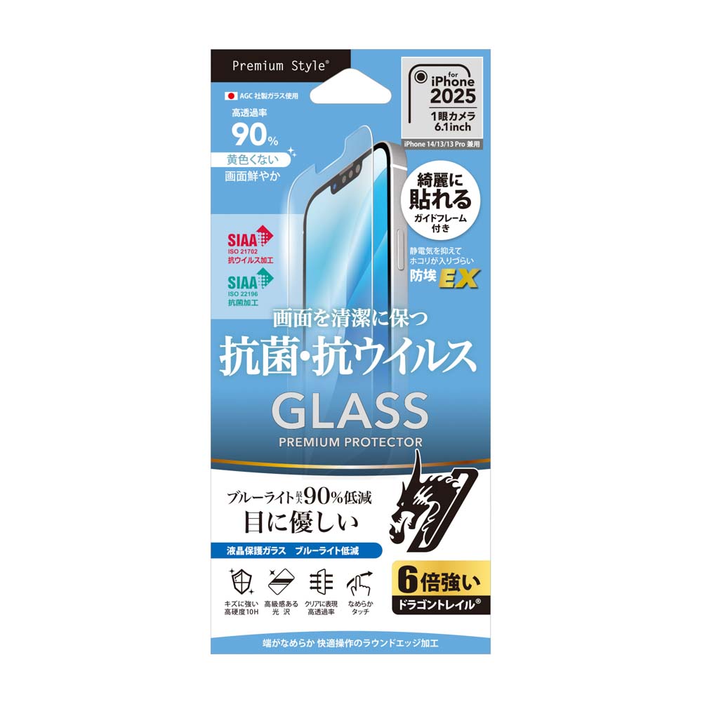 抗菌、抗ウイルス仕様の iPhone 16e/iPhone14/iPhone13/iPhone13 Pro兼用「液晶保護ガラス ブルーライト低減」