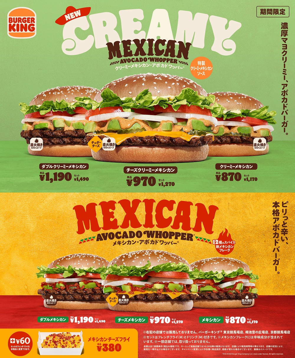 バーガーキングで大人気の「メキシカン・アボカドワッパー」に、新メニュー「クリーミーメキシカン・アボカドワッパー」の3種が期間限定で新たに登場。