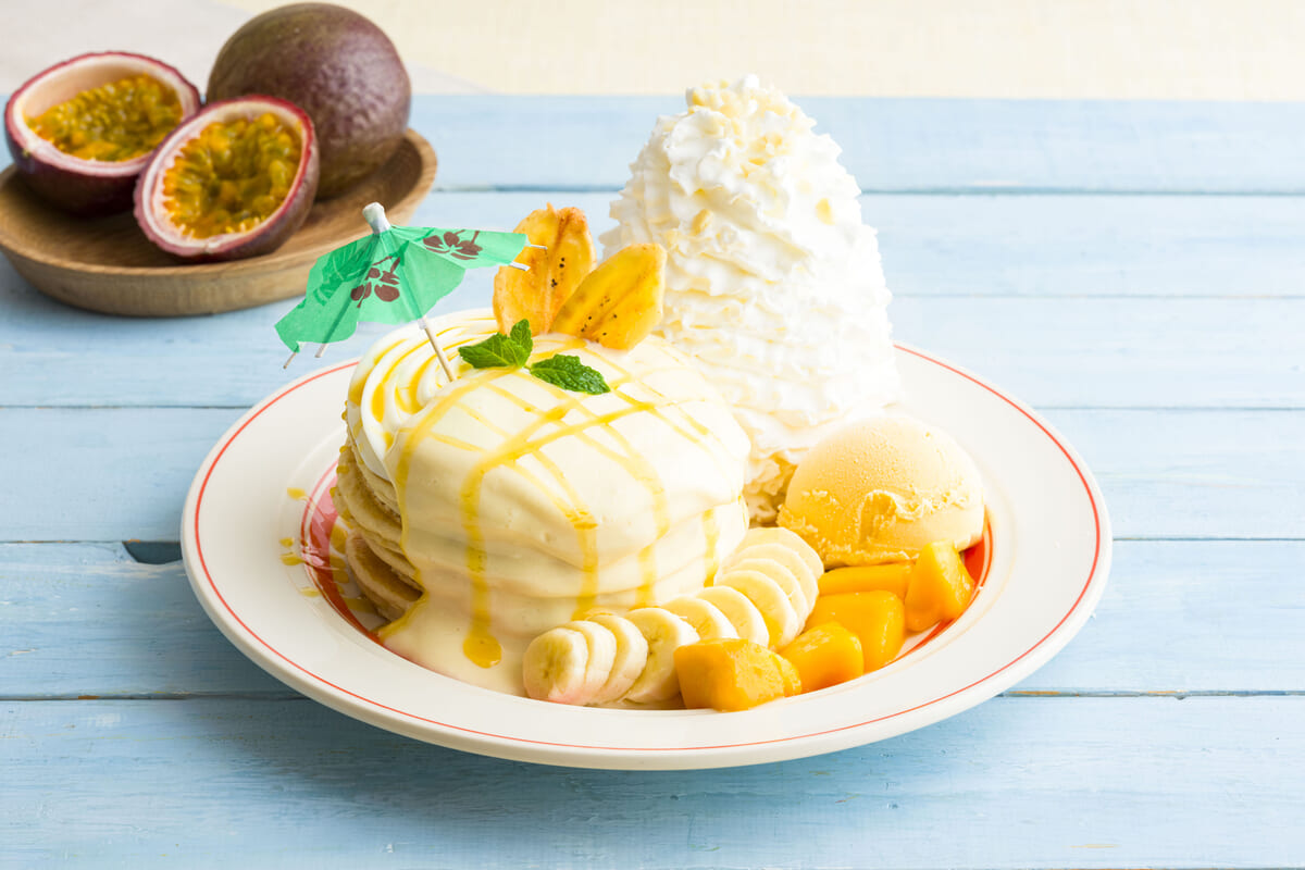 「リリコイマンゴーパンケーキ」は、ハワイならではのパッションフルーツ(リリコイ)が香るクリームソースをかけたパンケーキです。