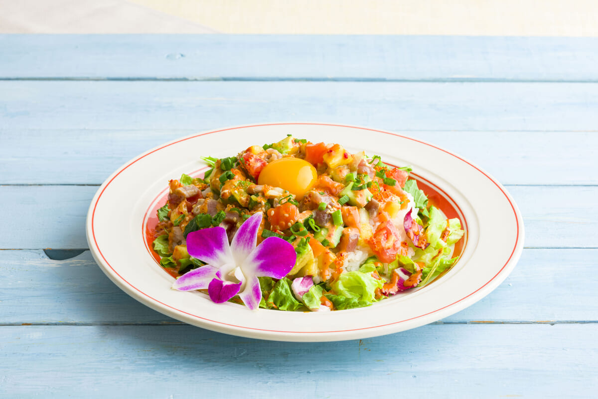 アヒポケやサーモンにパイナップルやたっぷりの野菜を散らした、華やかなメニューです。