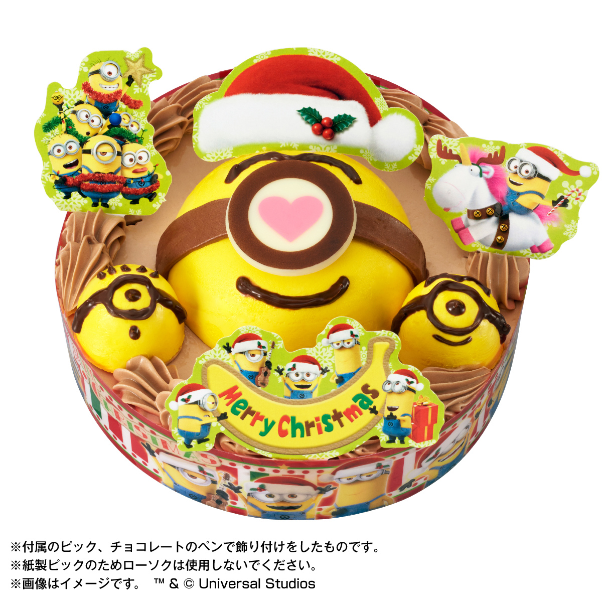 「キャラデコクリスマス ミニオン」は、アメリカの3DCGアニメーション映画『怪盗グルー』シリーズに登場するキャラクター「ミニオン」をモチーフにしたクリスマスケーキです。