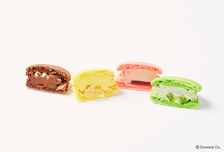 「Q-pot CAFE.」の特製マカロンには、チョコレート・ストロベリー・メロン・レモンのフレーバーが登場。