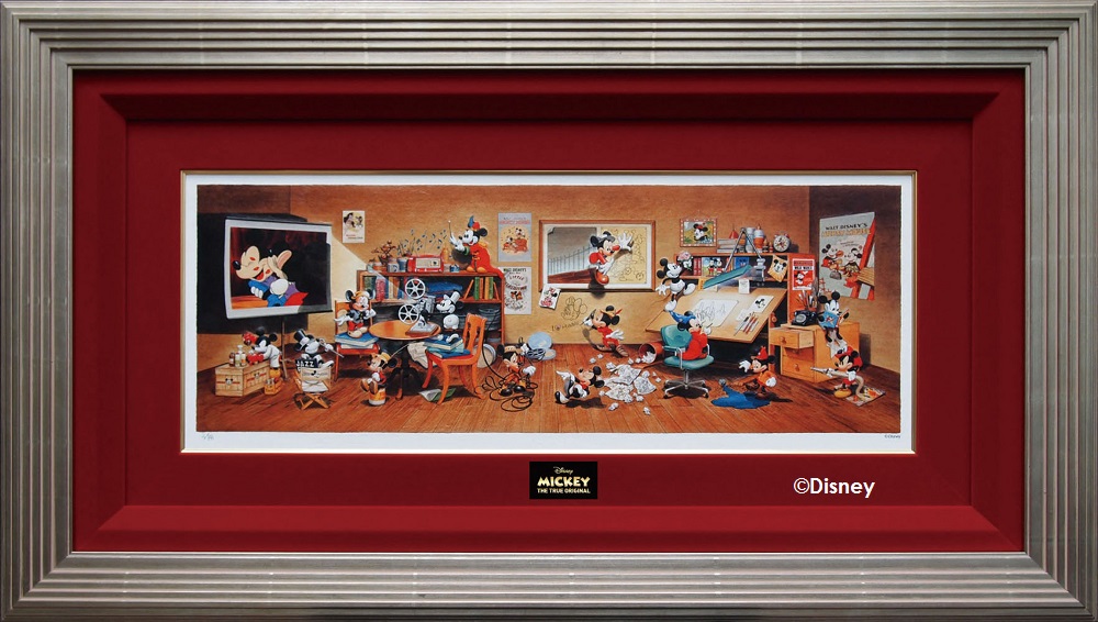 モザイク画印刷を施した額縁の窓ガラスと合わさることで、90周年記念のミッキーマウスが浮かび上がる仕様になっています。