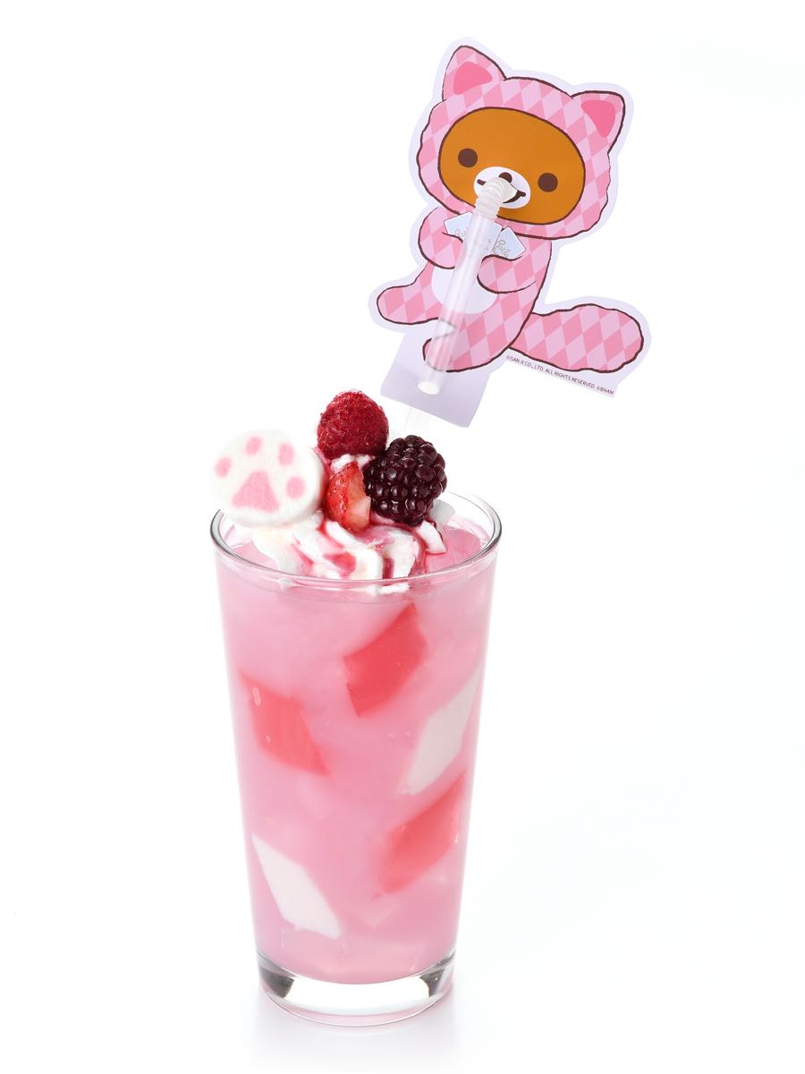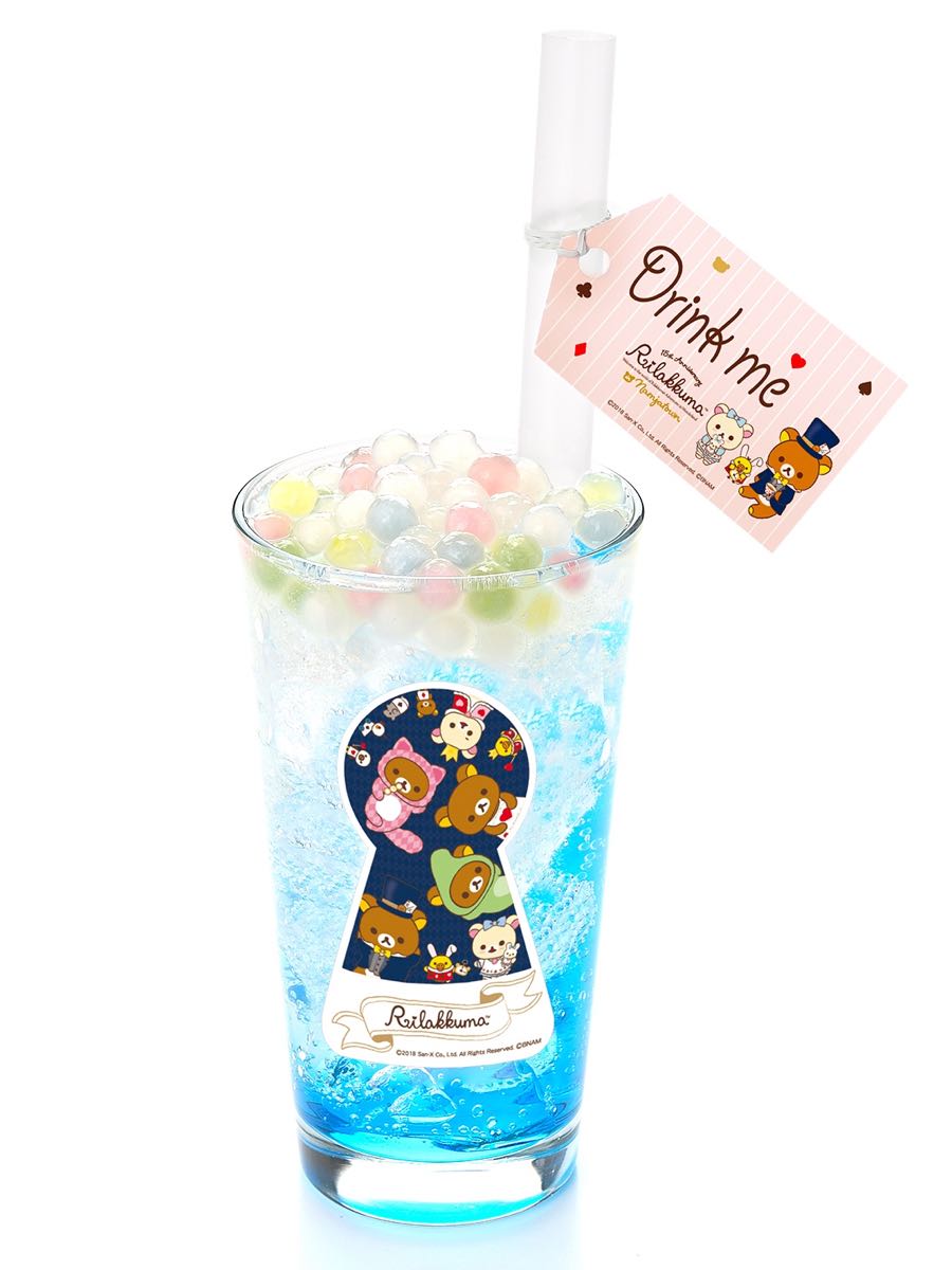 チェシャ猫に扮する「リラックマ」がストローに付属されたドリンク。