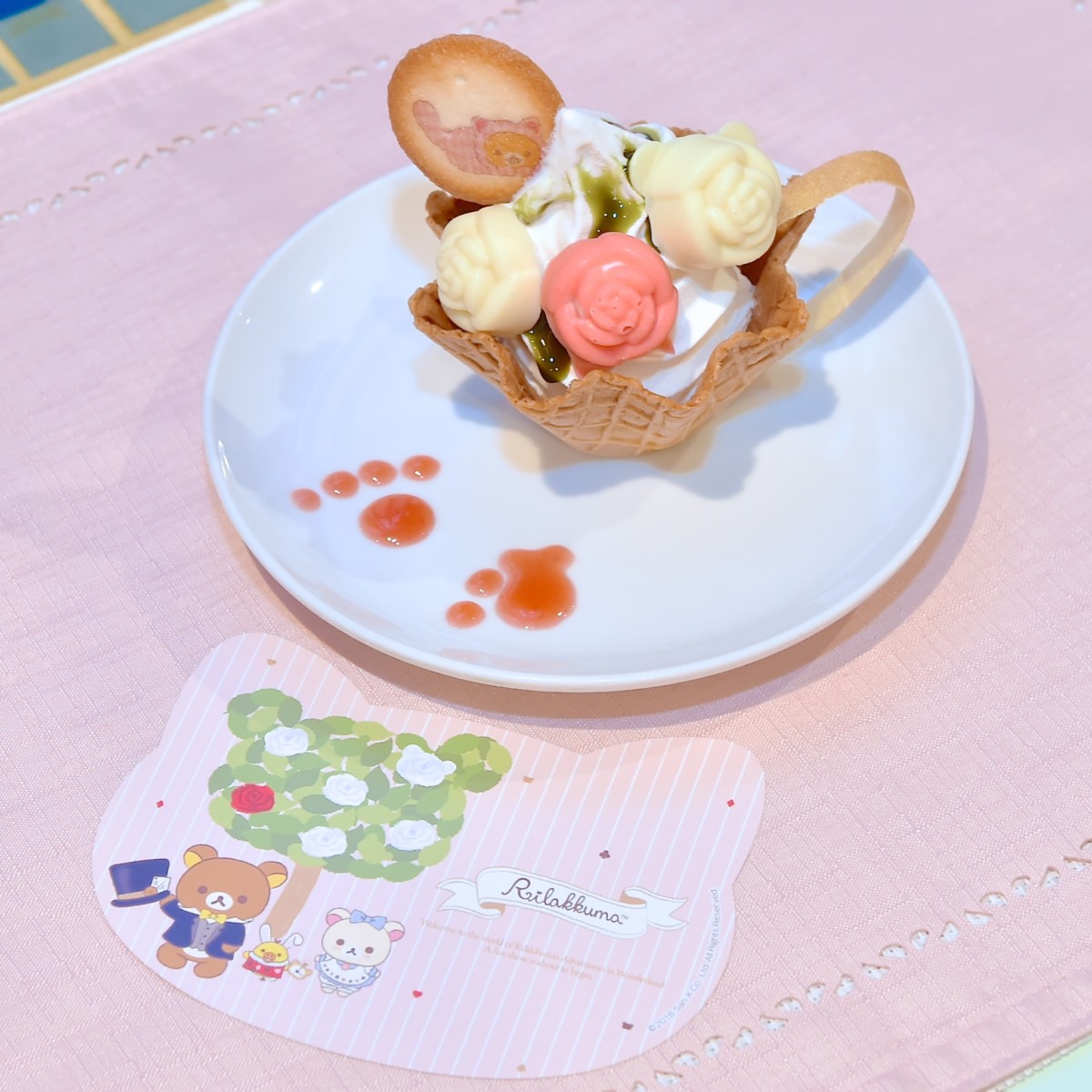 ワッフル型のカップにチェシャ猫「リラックマ」や薔薇をデコレーションしたソフトクリーム。