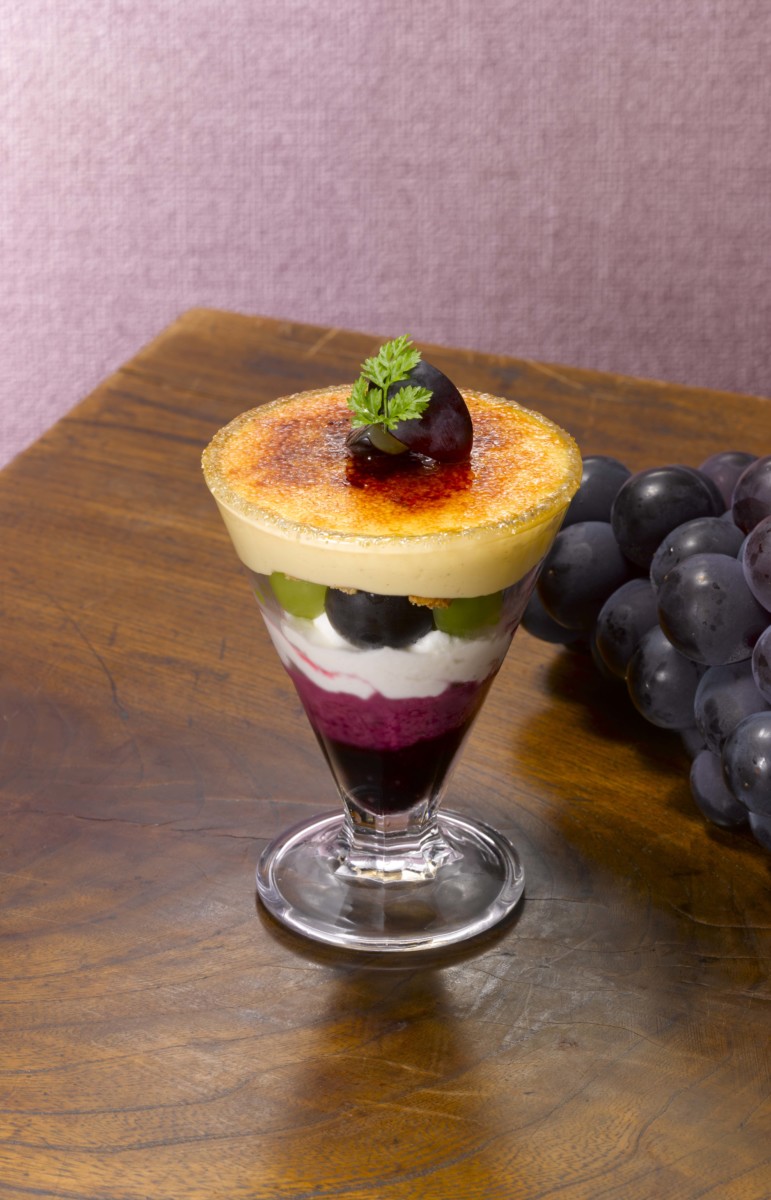 パリっとキャラメリゼしたクレームブリュレの下にフレッシュな葡萄が入ったパフェ。