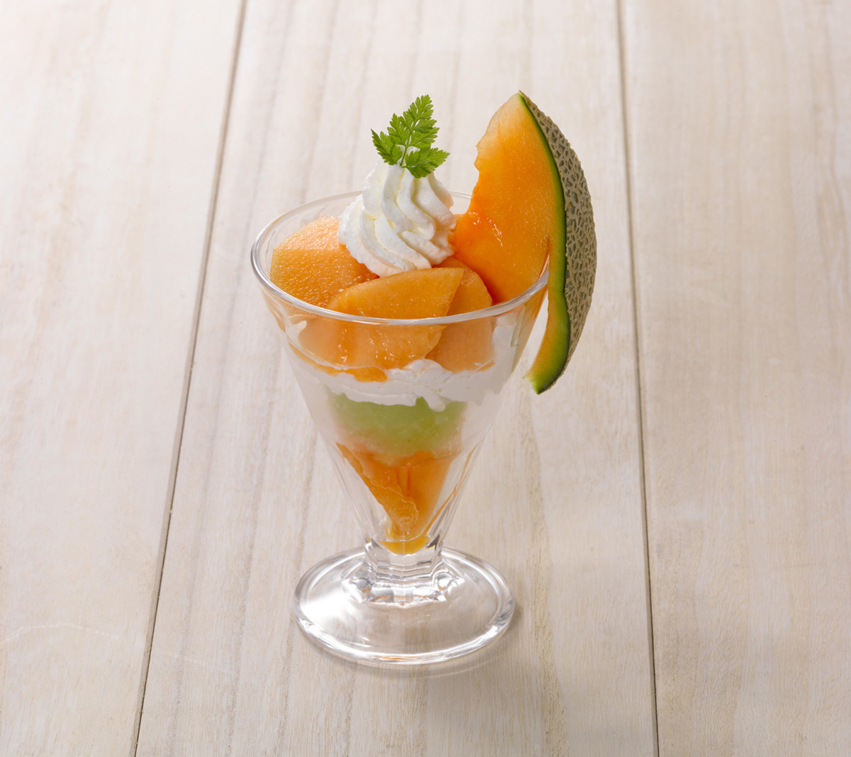 きらめくメロンゼリーの中にはオレンジ色のメロンが浮かんでおり、カラフルな見た目も一緒に楽しめます。