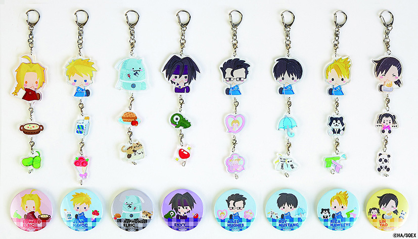 主人公の「エド」やその弟の「アル」の他、軍に所属する強い味方「ロイ」「リザ」など、個性豊かな8種類のアクリルキーホルダーセットと、トレーディング缶バッジです。