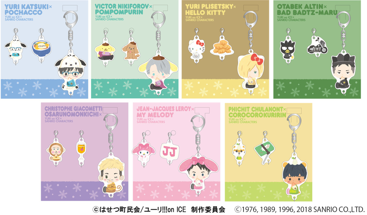 「Sanrio animestore 福岡PARCO店」オープンに合わせ、発売される「ユーリ!!!on ICE×Sanrio Characters」よこぐるみデザインのアクリルキーホルダーセットです。