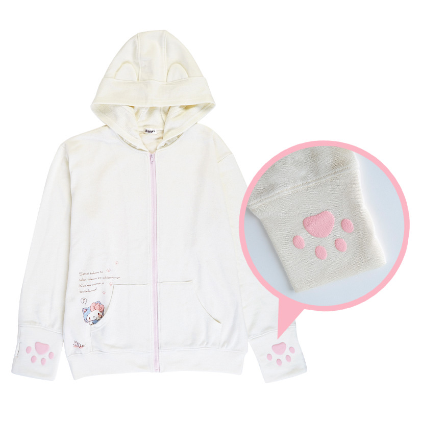 フードにねこ耳が付いているだけでなく、指あなの付いた袖口には、ぷっくり素材を使った肉球プリントが施されているのがポイントです。