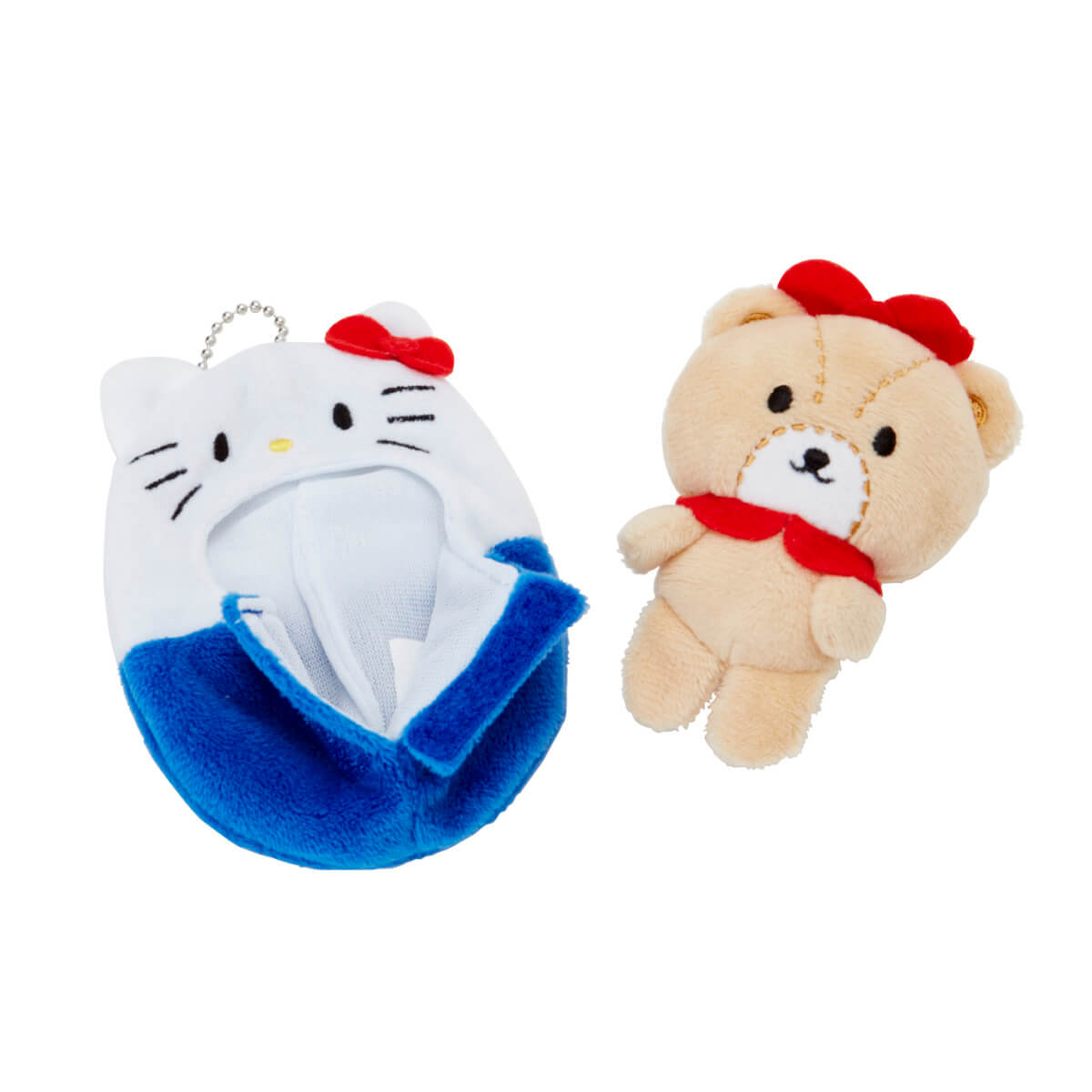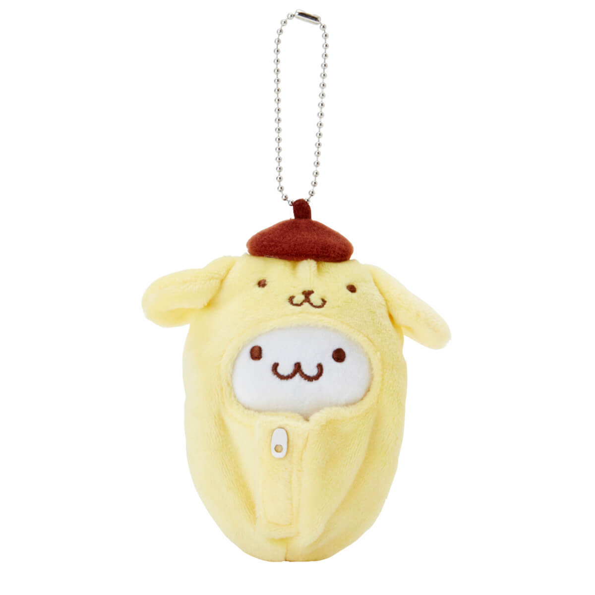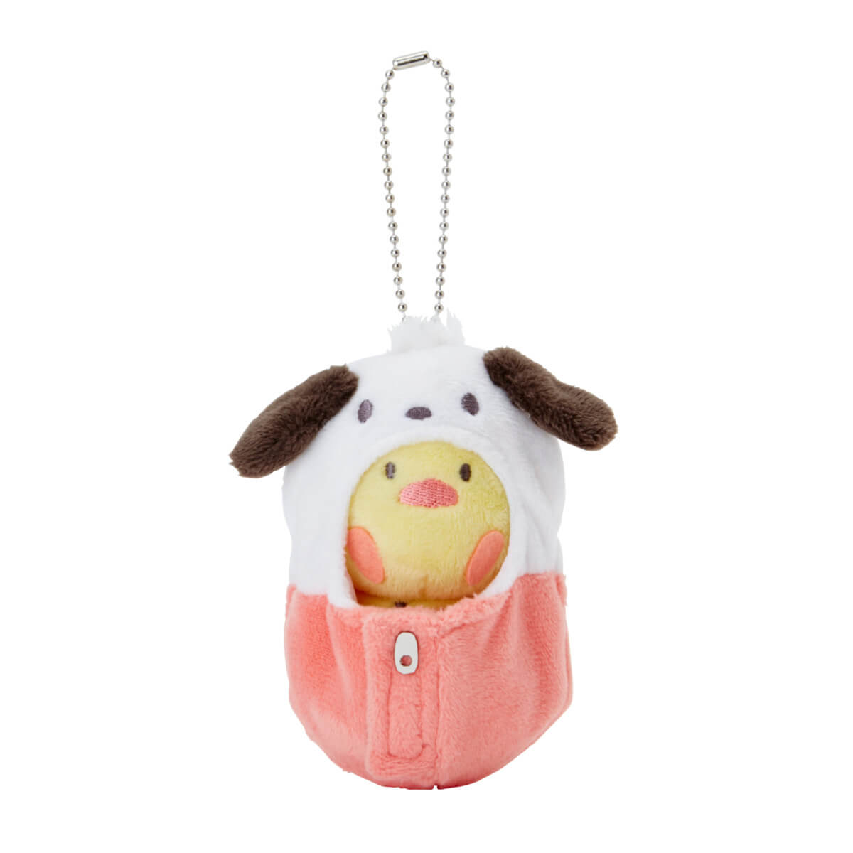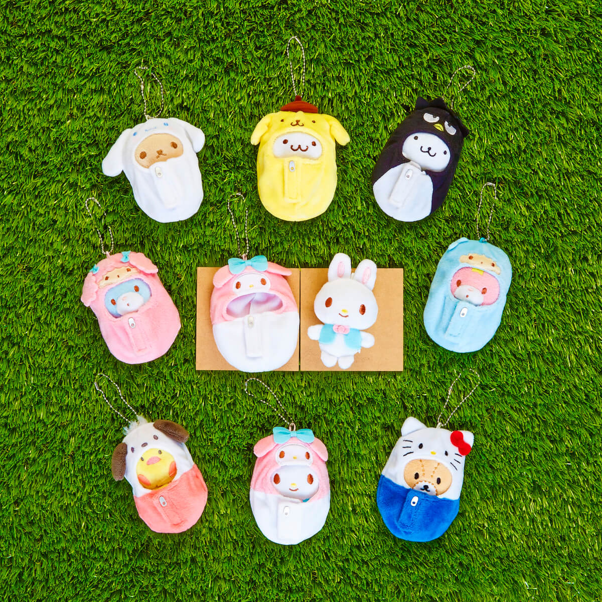 「ポムポムプリン」のお友だちハムスターの“マフィン”、「リトルツインスターズ」の“キキ&ララ”のくまのぬいぐるみのお友だち“パフ&ポフ”、そして「ポチャッコ」のお友だちの小鳥の“ピーちゃんズ”など、キャラクターデザインの寝袋に入った家族やお友だちたちのマスコットホルダーです。