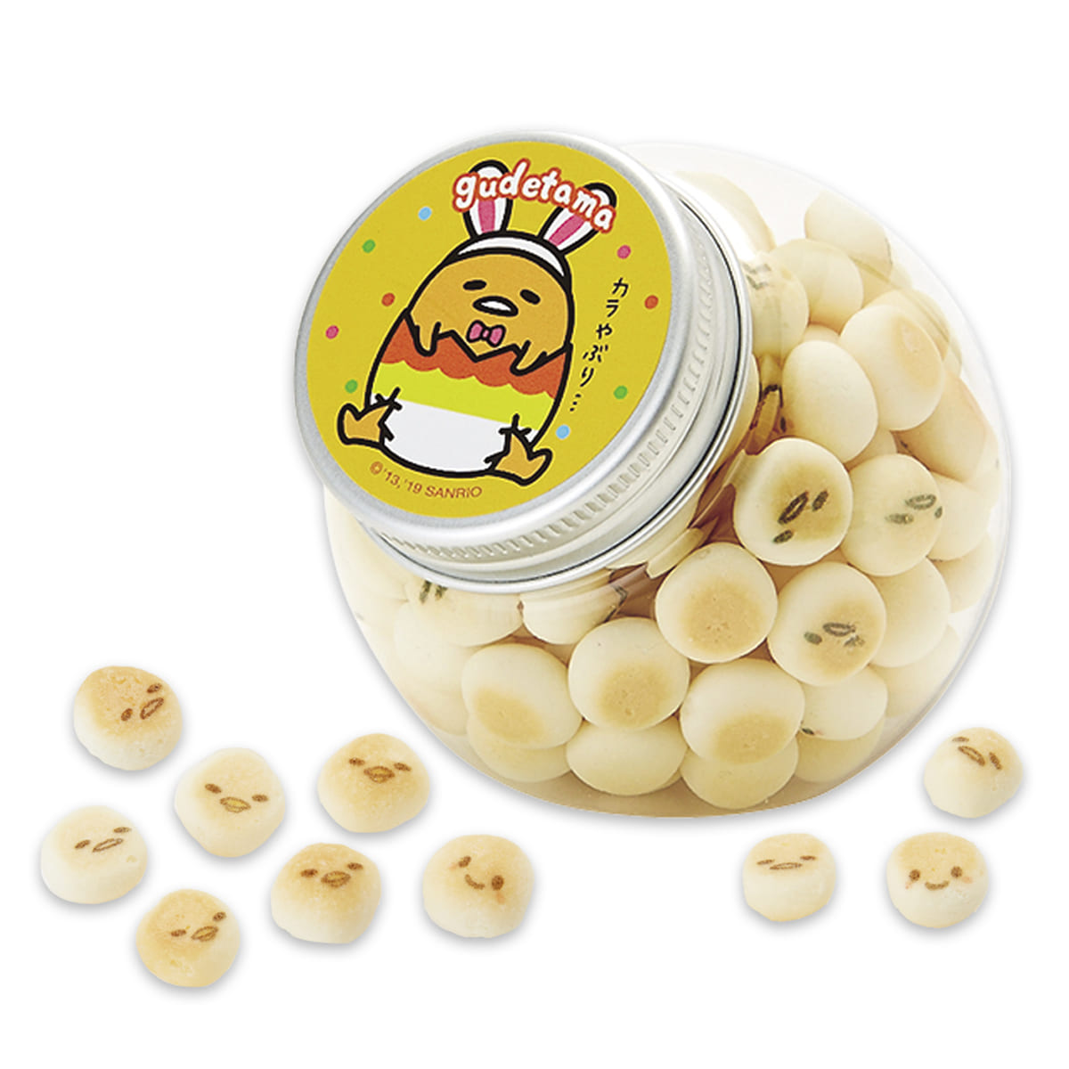 サンリオキャラクターがイースターのモチーフであるうさぎに扮したデザインを使用した瓶入りプリントボーロです。