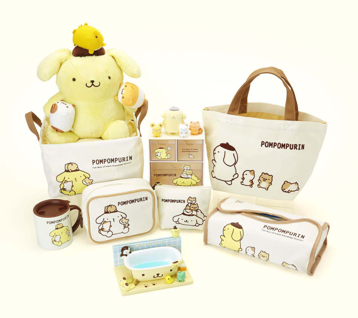 おなじみの「マフィン」を加えたハムスター3キャラが、大好きな「ポムポムプリン」にくっついちゃうデザインで、“いつでもプリンといっしょ”をテーマに、ぬいぐるみ、マグカップ、収納ケースなどのお家で使いたいインテリア小物と、外に持っておでかけしたいトートバッグやポーチなどがラインアップされています。
