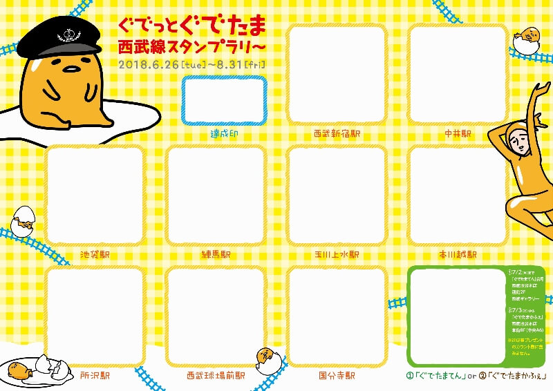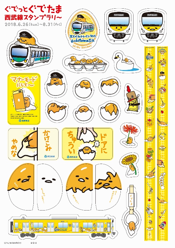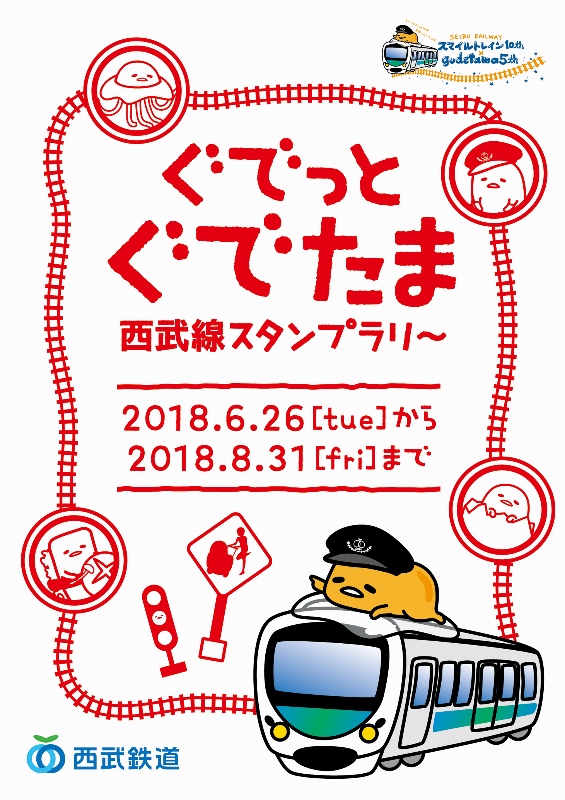 第4弾では、2018年6月26日(火)より「ぐでたまスマイルトレイン」デザインのオリジナルクリアファイル&シールセットがもらえる「ぐでっと『ぐでたま』西武線スタンプラリー」を実施。
