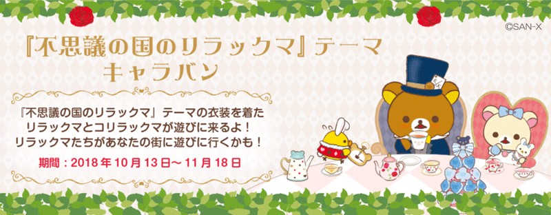 リラックマの最新テーマ「不思議の国のリラックマ」の店頭キャンペーンとキャラバンは、対象店舗にて、2018年10月13日(土)から始まります。