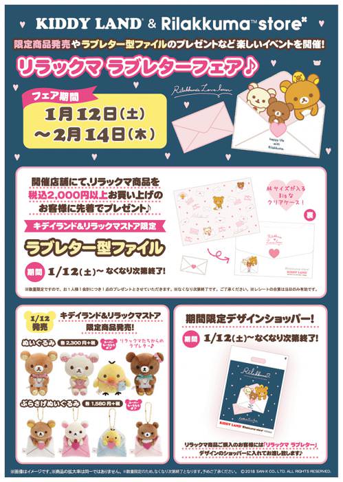 リラックマストア&キデイランドの「リラックマ ラブレター」フェアは、2019年1月12日(土)〜2月14日(木)までの期間限定で開催です☆