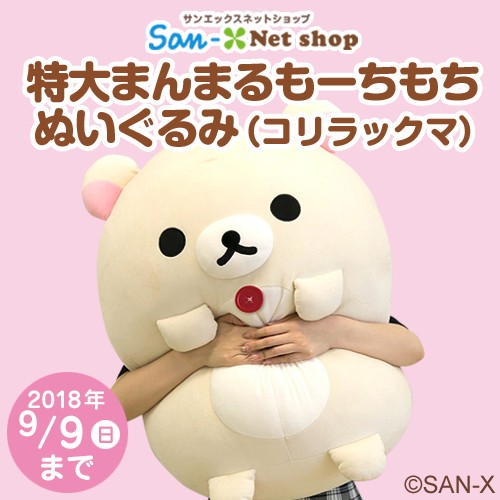 「特大まんまるもーちもちぬいぐるみ(コリラックマ)」は、サンエックスネットショップにて、2018年9月9日(日)まで注文受付中です。