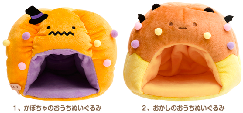 ハロウィンの雰囲気たっぷりな「かぼちゃのおうちぬいぐるみ」と「おかしのおうちぬいぐるみ」。