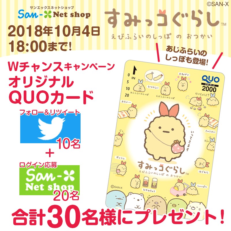 すみっコぐらし「えびふらいのしっぽのおつかい」テーマのオリジナルQUOカードが抽選で当たるWチャンスキャンペーンは、サンエックスネットショップにて、2018年10月4日(木)18:00まで開催中です☆