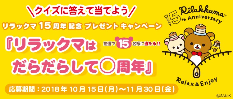 「リラックマ15周年プレゼントキャンペーン」が、サンエックスネットの「リラックマ15周年特設サイト」にて、2018年11月30日(金)まで開催中!