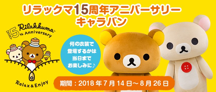リラックマ「15周年記念 店頭キャンペーン&キャラバン」は、2018年7月14日(土)より、対象店舗にて開催です。