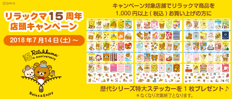 キャンペーン対象店舗でリラックマ商品を1,000円以上(税込)お買い上げの方に、歴代シリーズ特大ステッカーをいずれか1枚プレゼント!(全3種)