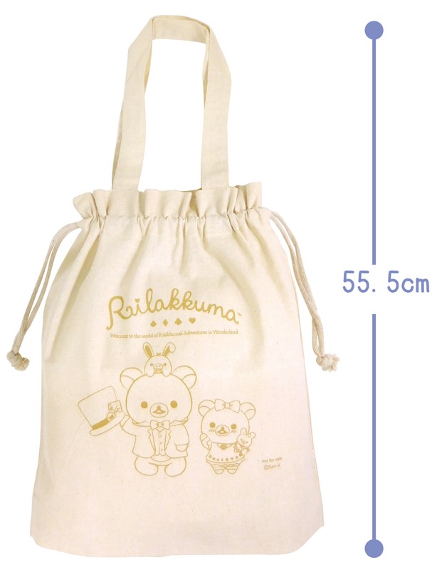 シンプルな巾着トートバッグに、「不思議の国のリラックマ」テーマのイラストがプリントされています。
