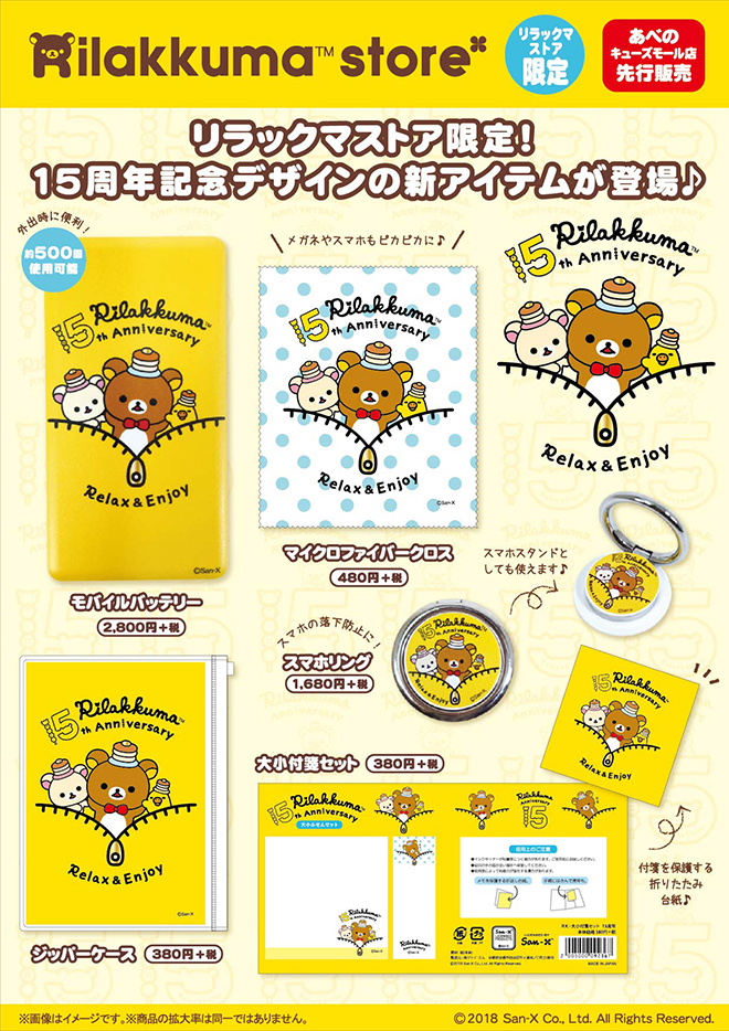 「リラックマ 15周年記念デザイン 新アイテム」は、リラックマストアあべのキューズモール店にて、2018年6月8日(金)先行発売です。