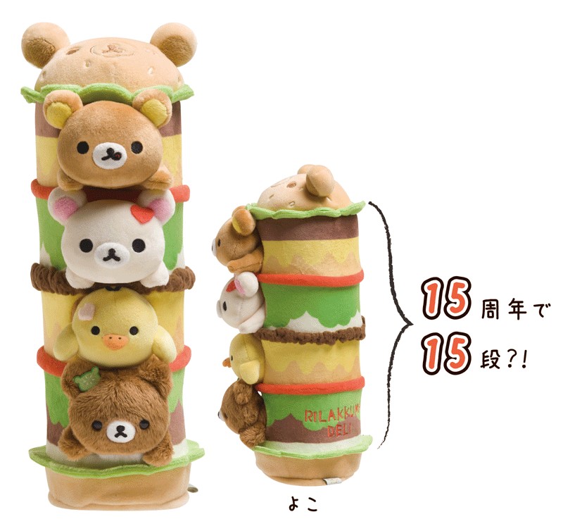 「ぬいぐるみ」はリラックマ&ピザ、コリラックマ&ドーナツの2種類、「スペシャルぬいぐるみ」は15段のハンバーガータワーにリラックマたちが入った楽しいぬいぐるみです♪