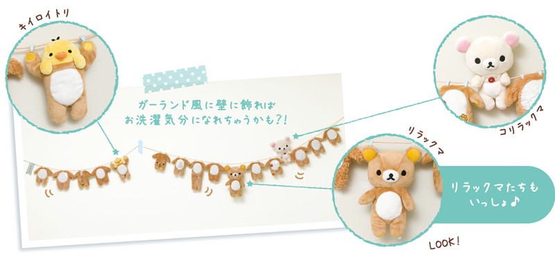 着ぐるみを手に頬を赤らめるリラックマ、洗濯済みの着ぐるみを几帳面に畳むキイロイトリ、そして、リラックマの着ぐるみで遊ぶコリラックマの3種類!