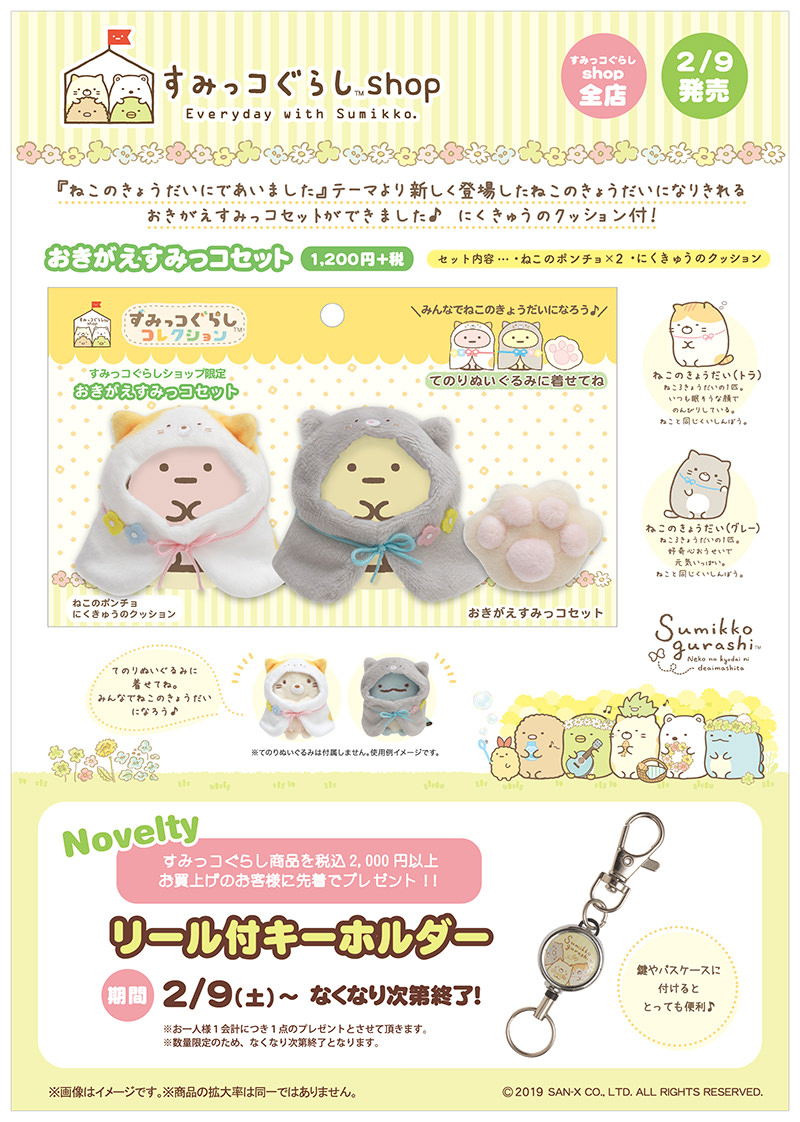 ノベルティ「リール付キーホルダー」と新商品「おきがえすみっコセット」は、すみっコぐらしshopにて、2019年2月9日(土)登場です。