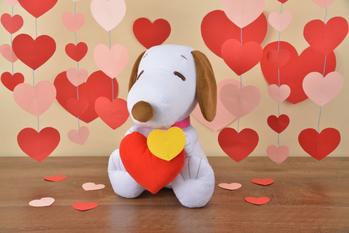 ハートにあふれた「スヌーピー」のぬいぐるみ。