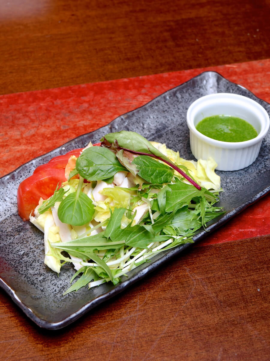前菜はヘルシーな蒸鶏がたっぷりなサラダ。
