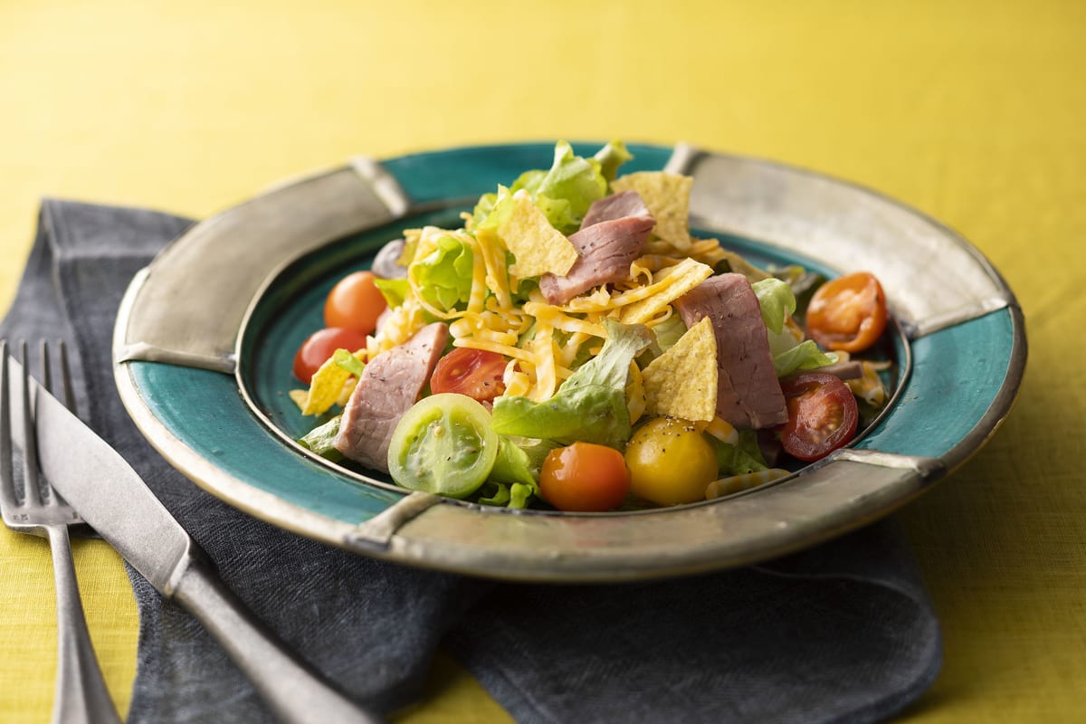 コールドビーフとメキシコ料理のタコスを混ぜ合わせたサラダ。