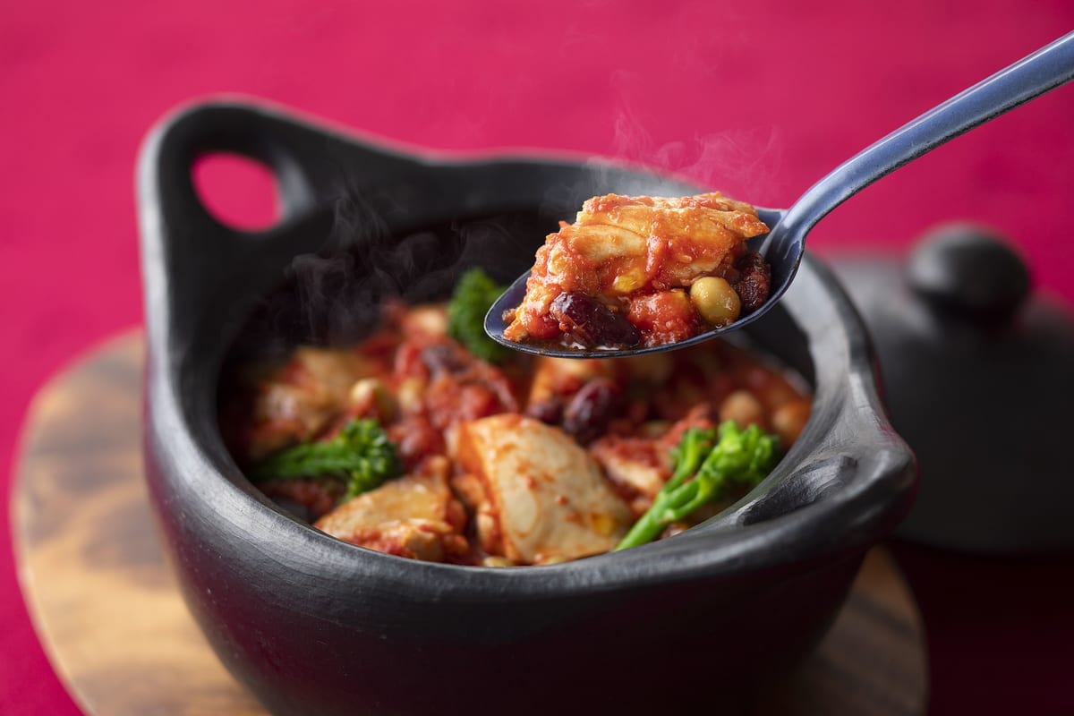 トマトソースでグツグツと煮込んだ熱々の鶏肉が食欲をそそります。