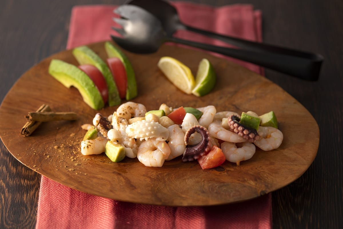 タコやイカ、エビなどのシーフードたっぷりのサラダを、シナモンを効かせたフレンチドレッシングで和えています。