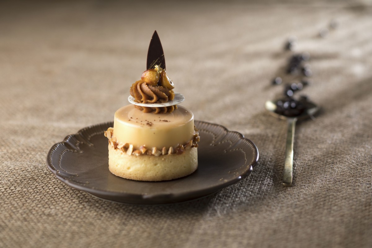 ヘーゼルナッツクリームとミルクチョコのガナッシュを閉じ込めたタルトに、グアテマラ産コーヒーのムースが重なっています。