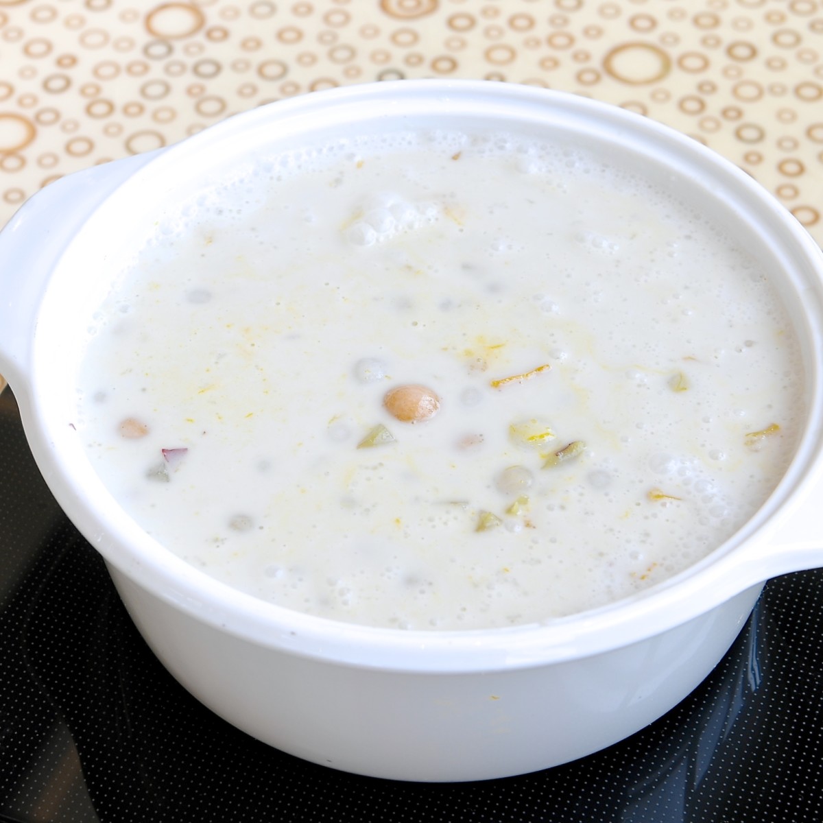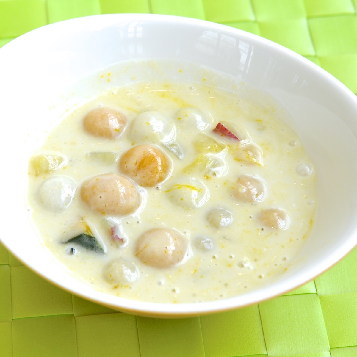 ココナッツが豊かに香る真っ白のスープに、ツルツルもちもちの小さなお団子が入ったライスダンプリング。