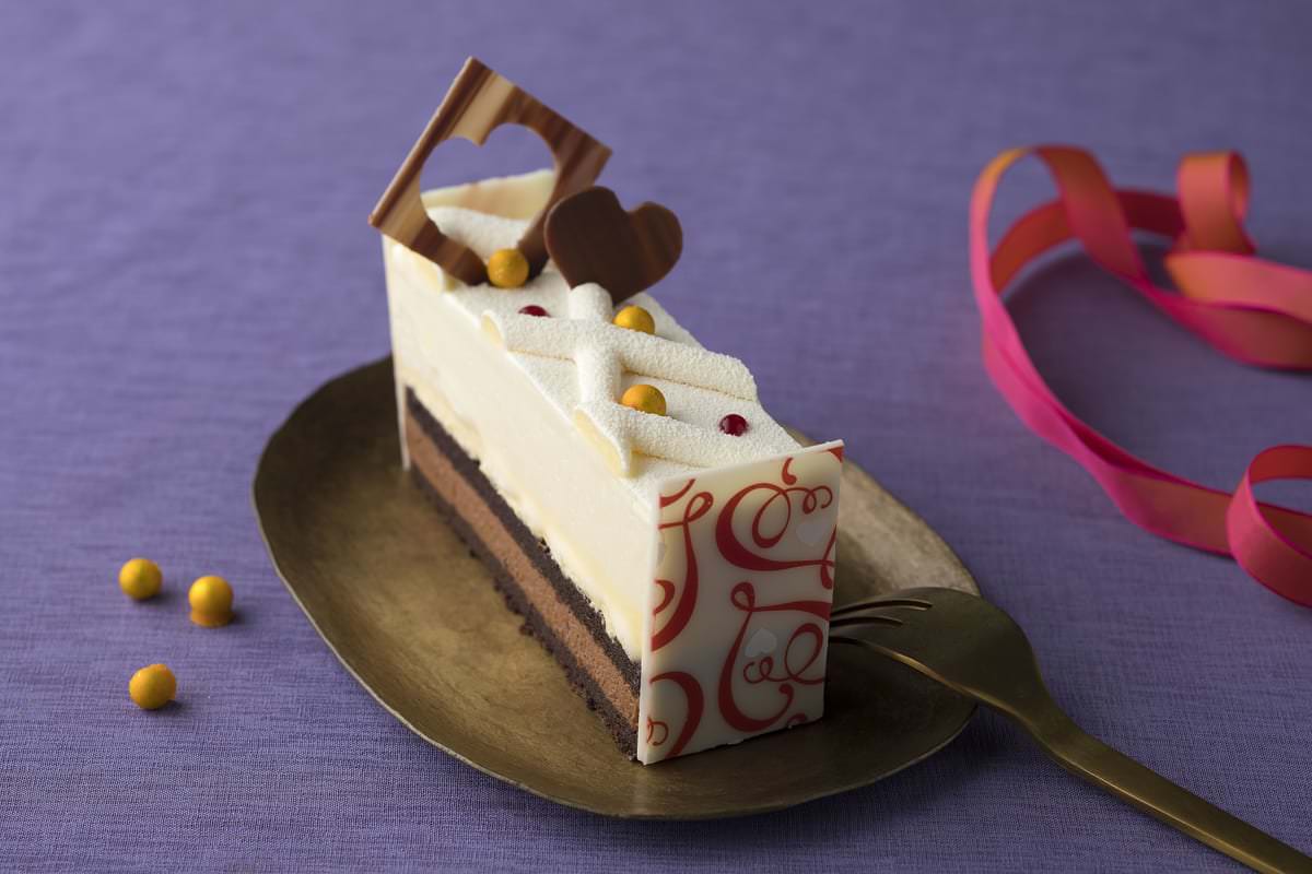 なめらかなチョコレート生地に、チョコレートムース、オレンジムース、ホワイトチョコムースを重ねた層が美しいムース。