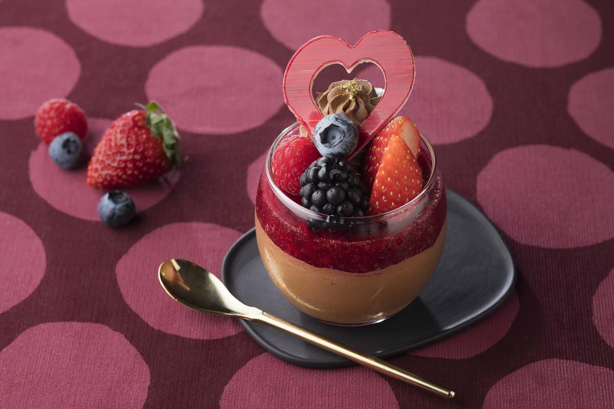 いちご、ラズベリー、ブルーベリー、チョコレートクリームとハートのトッピングがかわいいグラススイーツです。