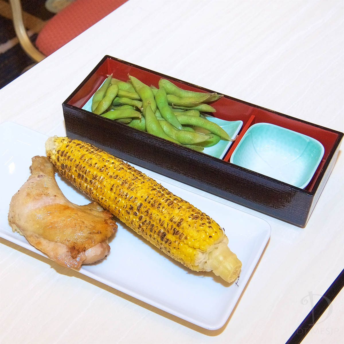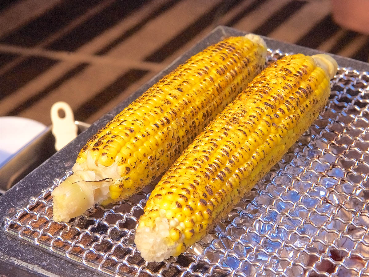 茹でたての枝豆、下総醤油風味の焼きとうもろこし、