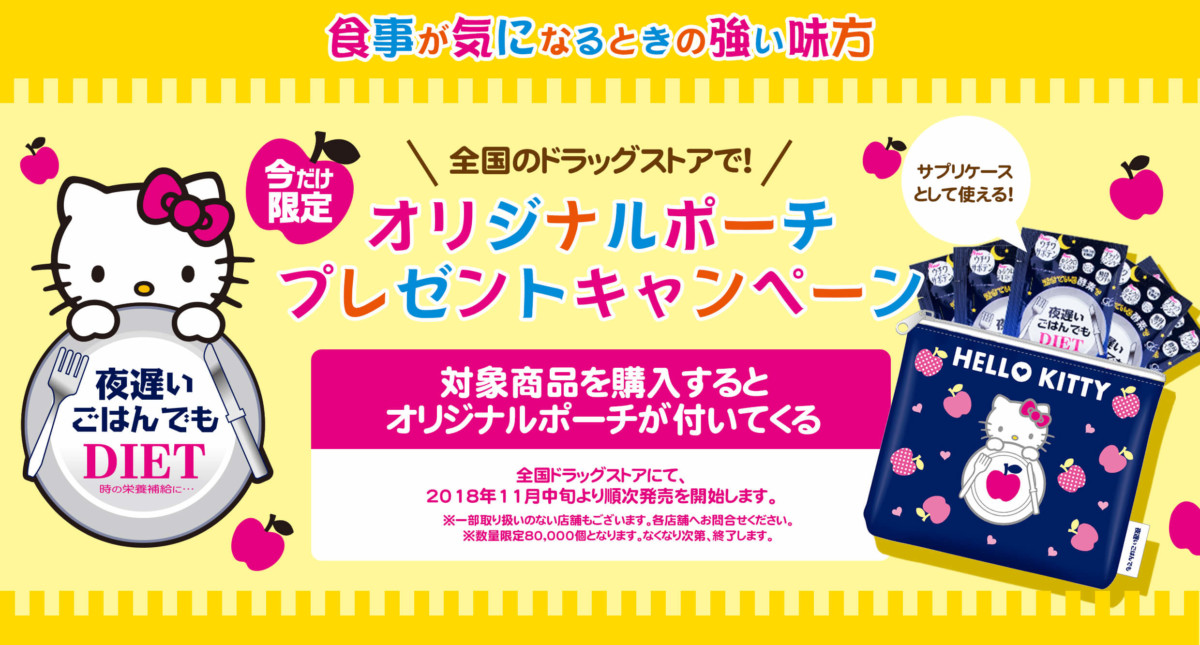 新谷酵素は、酵素サプリメント「夜遅いごはんでも」の対象商品を購入すると「夜遅いごはんでも×HELLO KITTYオリジナルポーチ 」が付いてくるプレゼントキャンペーンを開催。