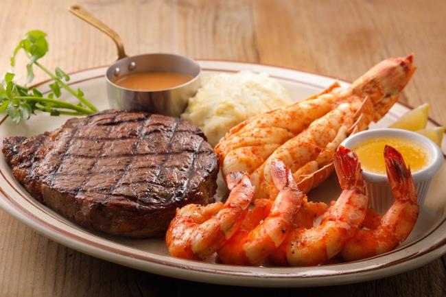 リブロースステーキ280gとロブスター、シュリンプ4尾がセットになった、海の幸と大地の恵みを心ゆくまで楽しめるスペシャルなコンボ。