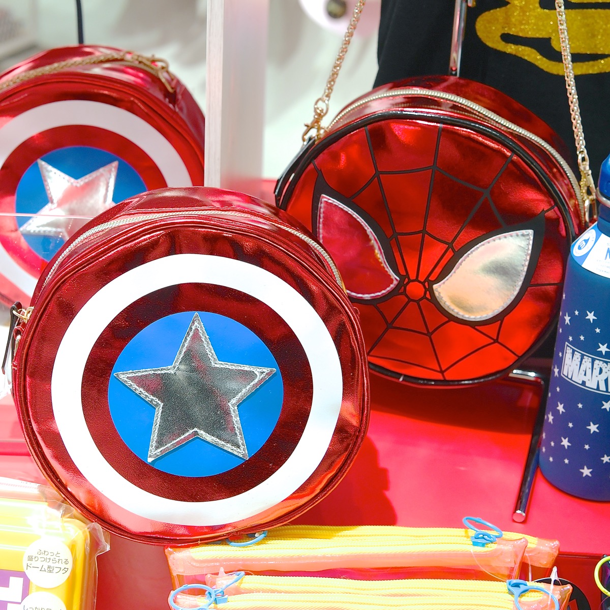 「MARVEL」の人気ヒーロー「キャプテン・アメリカ」と「スパイダーマン」がデザインされた丸型バッグ。