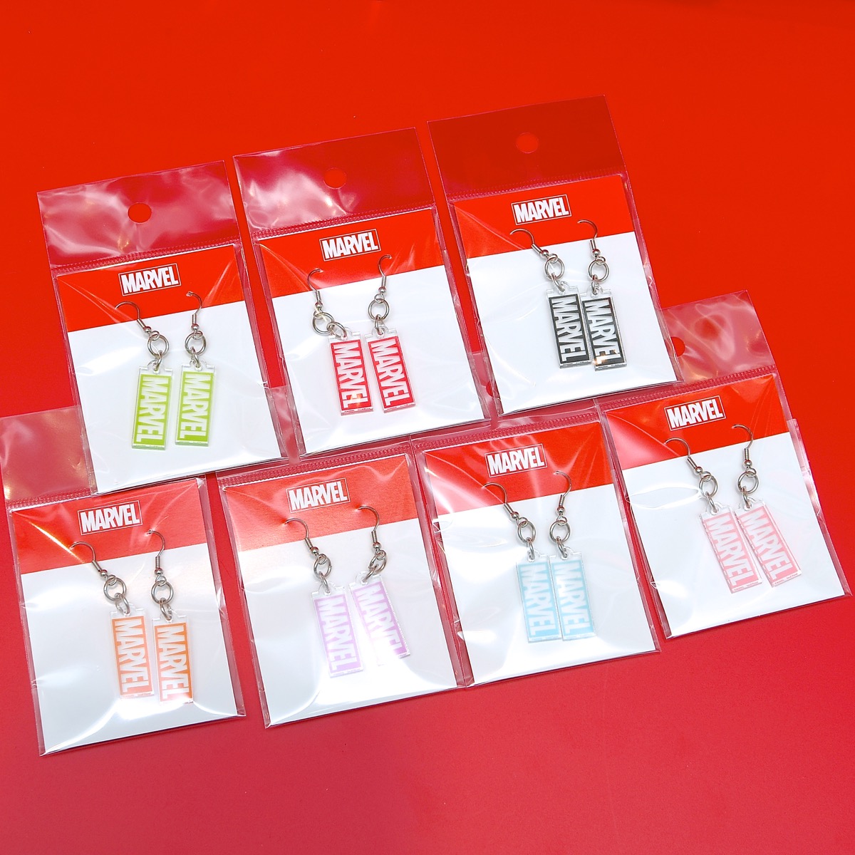 MARVELのボックスロゴをカラフルにアレンジしたピアスは7色展開!